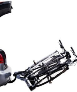 - Al abatirse, lo amplio del ángulo permite abrir incluso los portones traseros más grandes (p.ej. VW T5), aún con cuatro bicicletas montadas.