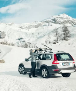 - Transporta de forma segura esquís y tablas de snowboard modernos y más gruesos y reduce la altura del soporte al estar descargado, debido al sistema de resortes verticales integrados